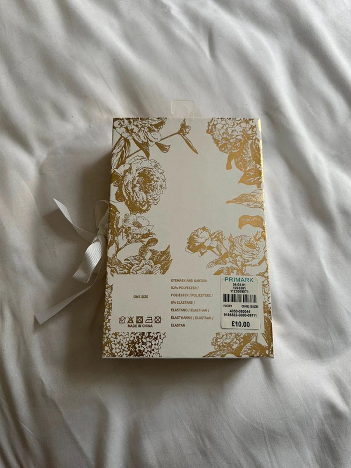 Bridal sleepwear set including a sash, eye mask, and additional bridal accessories.