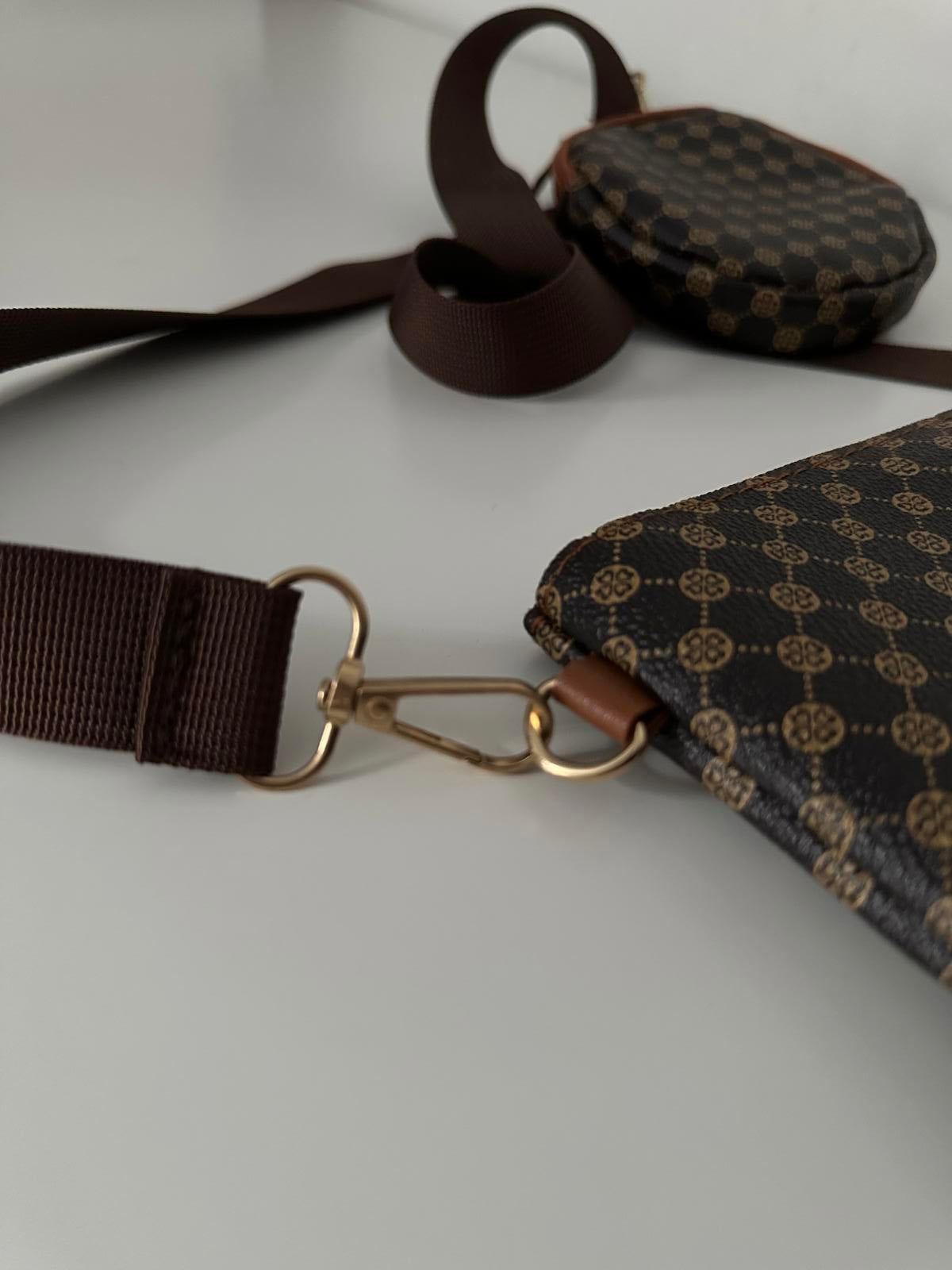 Chic and practical, this brown monogram crossbody bag comes with a detachable matching coin pouch for extra storage. Featuring an adjustable strap for comfort, gold-tone hardware for a luxe touch, and a stylish vintage-inspired monogram print, this bag is perfect for everyday use or casual outings. Its lightweight design makes it versatile as a crossbody or shoulder bag. A must-have accessory that combines fashion with function!