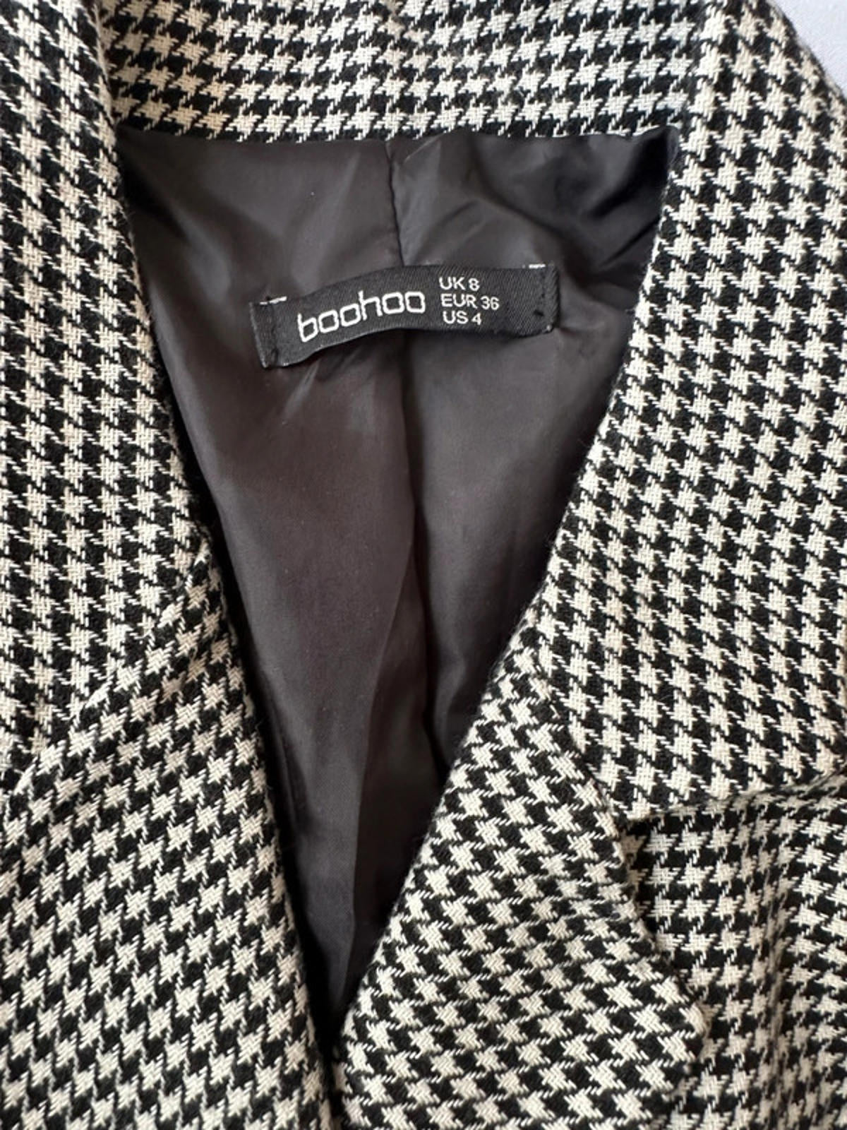Elevate your wardrobe with this chic Boohoo double-breasted blazer styled coat, featuring a timeless houndstooth print.