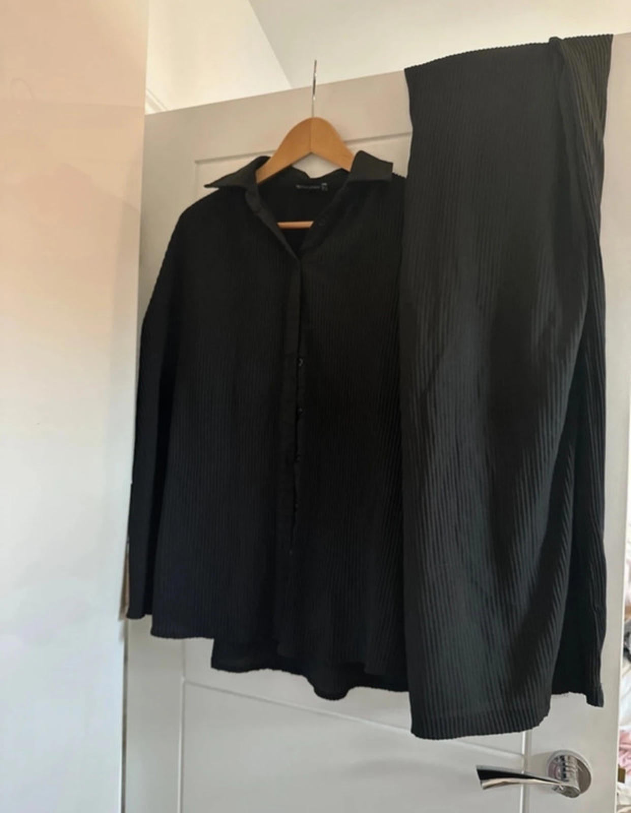 Elevate your wardrobe with this stunning black pleated shirt and trousers set, perfect for both casual and formal occasions.
