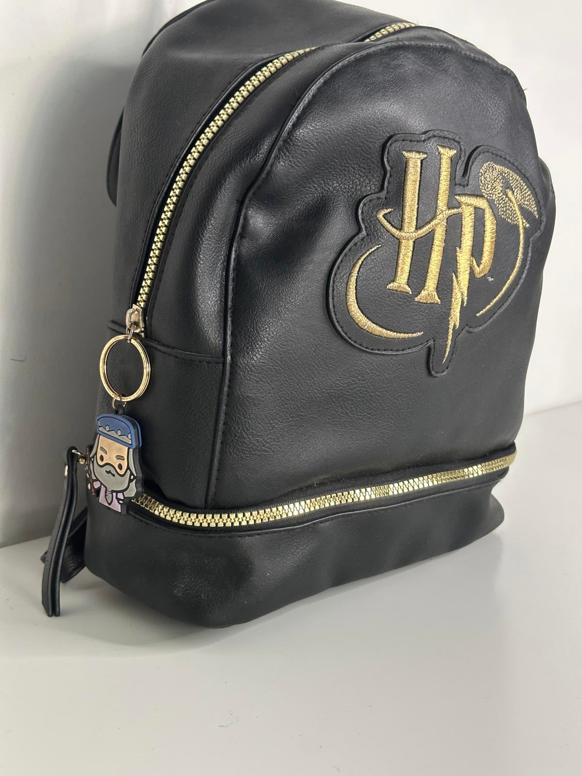 Step into the Wizarding World with this stylish Harry Potter mini backpack. Crafted in sleek black faux leather with a bold gold embroidered HP logo, it’s the perfect accessory for fans. Featuring a roomy main compartment, secure zip closure, and adjustable straps for comfortable wear. The gold-tone zips and fun Dumbledore zip pull add extra magic. Compact yet practical – ideal for daily use, conventions, or displaying your fandom in style.