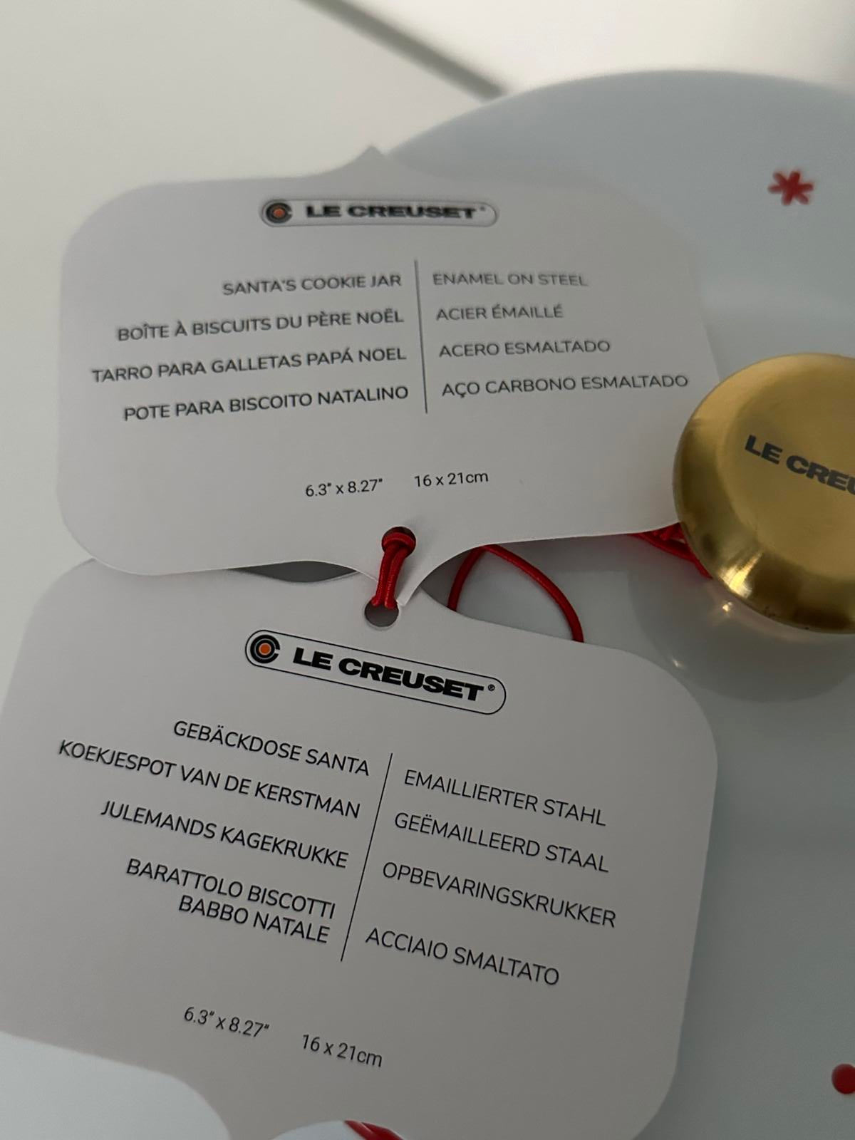 Festive Le Creuset Noël cookie jar/canister with stylised Santa print and gold knob lid. Large 4.0L (4.25qt) capacity, perfect for cookies, treats or Christmas kitchen storage. Durable enamel on steel, wipe clean. Seasonal centrepiece for countertops or gifting.