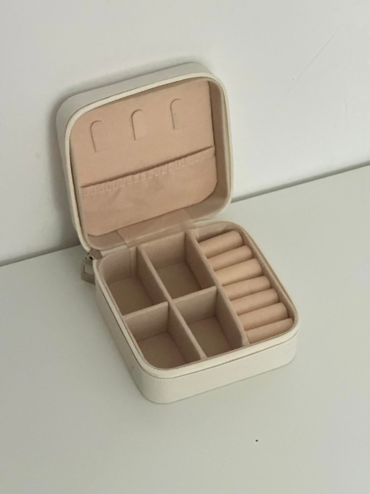 Keep your jewellery safe and organised with this compact personalised jewellery travel case. Features multiple compartments for rings, earrings, and necklaces, plus a soft interior lining to protect your pieces. Beautiful white outer case with gold "K" initial, floral detail, and "Kirsty" name. Perfect for travel or everyday use.