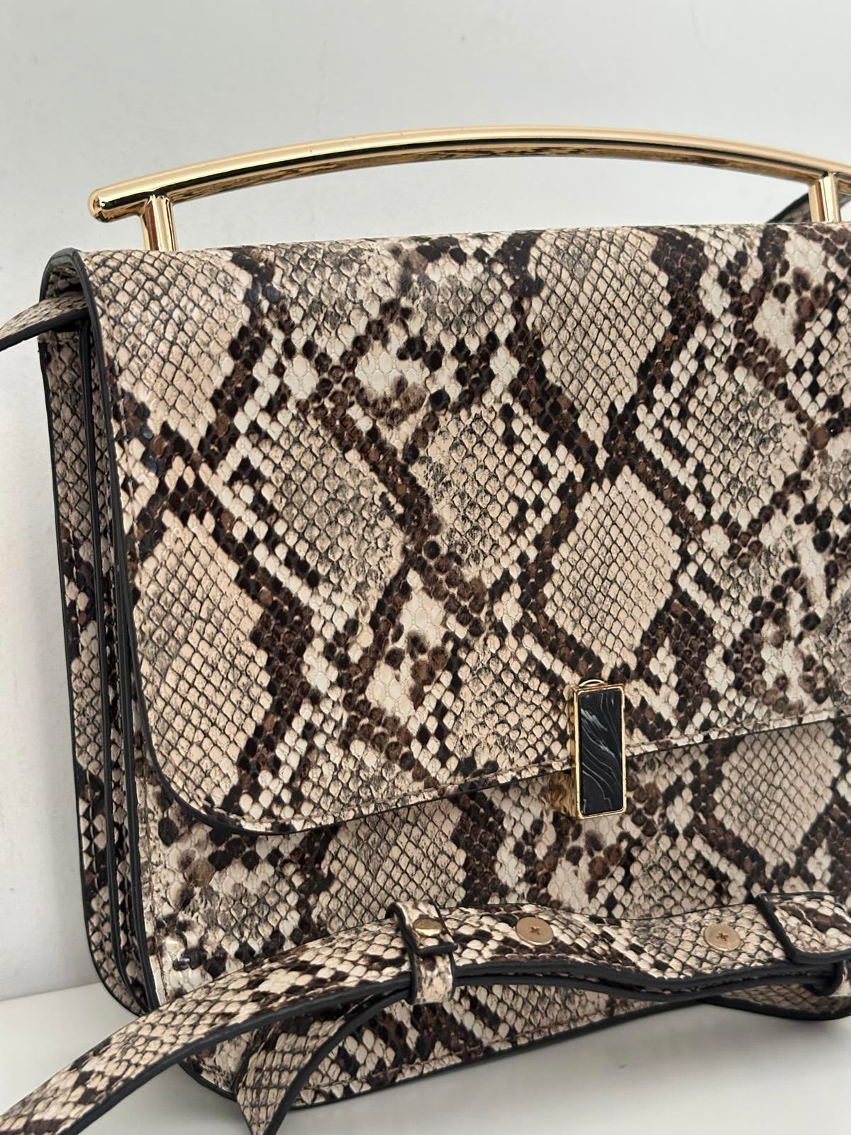 Step up your accessories game with this chic Topshop snake print crossbody bag. Designed with a striking faux snakeskin finish and a luxe gold bar handle, this bag brings high-street sophistication to your everyday or evening looks. The adjustable strap makes it perfect for crossbody wear, while the structured flap closure with gold and black detailing adds a premium touch. Spacious enough for your essentials, yet compact for effortless style. A versatile piece that pairs perfectly with both casual and dressy outfits.